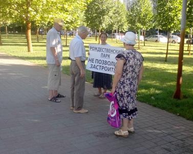 Много гражданских активистов Юбилейного микрорайона вышли также на одиночные пикеты. Жители этого микрорайона вышли с наболевшими за многие годы вопросами: прекратить строительство многоэтажек, вернуть детям ЮМР построенный дом культуры, строительство детских садов и школ а так же не трогать Рождественский парк в плане застройки НСИ-ЮГ многоэтажками, которое планируется в ближайшее время так как суд назначен на 26 июля в Ростове-на-Дону еще по 2 гектарам парковой нашей зоны!!! Жителям юбилейного ничего не остается как выходить с пикетами так как действующая власть кроме отписок, обещаний из года в год так и не создала комфортных и благоприятных условий жизни для жителей ЮМР.