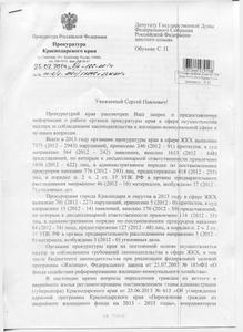 На имя депутата Госдумы от Краснодарского края (фракция КПРФ) С.П. Обухова пришло письмо от исполняющего обязанности прокурора Краснодарского края И.А. Бабаева. Ранее депутат запрашивал информацию о работе органов прокуратуры края в сфере осуществления надзора за соблюдением законодательства в жилищно-коммунальной сфере.