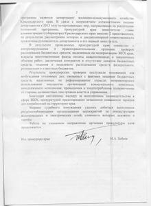 «В связи с непринятием должностными лицами департамента в 2013 году исчерпывающих мер, направленных на реализацию положений краевой программы «Переселение граждан из аварийного жилищного фонда на 2013-2015 гг», прокуратурой края заместителю главы администрации (губернатора) Краснодарского края внесено два представления, по результатам рассмотрения которых к дисциплинарной ответственности привлечены руководитель департамента и его первый заместитель», - сообщил И.А. Бабаев.