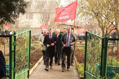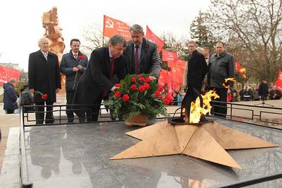 Затем под руководством первого секретаря Красноперекопского отделения КПРФ П.А. Синякова на центральной площади города было проведено торжественное поднятие флага партии. Право выполнить эту почётную миссию было предоставлено заместителю председателя ЦК КПРФ Д.Г. Новикову и первому секретарю Крымского рескома КПРФ О.А.Соломахину.