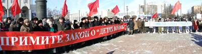 Участники акции единодушно потребовали от Государственной и областной Думы принять закон о социальной поддержке такой обездоленной и довольно многочисленной части населения, как “дети войны”, рождения 1928-1945 годов. Одновременно прозвучали требования смены политического курса, усиления социальной направленности бюджета страны и области.