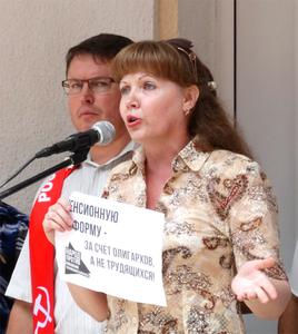 Председатель КРО ООО «Надежда России» Анжелика Данилова, выступая, отметила, что женщина не должна, да и физически не может работать до 63 лет. Она должна воспитывать детей, помогать внукам. Депутаты Госдумы от «Единой России» в Курске избрались и уехали в столицу, забыв о своих обещаниях. Выступающая предложила «гнать их в шею» - выразить всеобщее недоверие. Ее очень активно поддержали митингующие – аплодировали все присутствующие на площади.