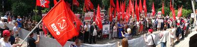 Около 2 тысяч собравшихся на митинг держали большие растяжки: «КПРФ против повышения пенсионного возраста», «Медведева – в отставку!».
