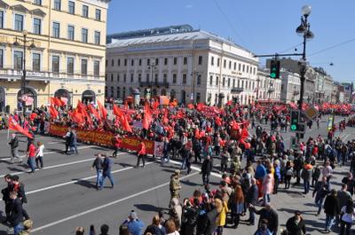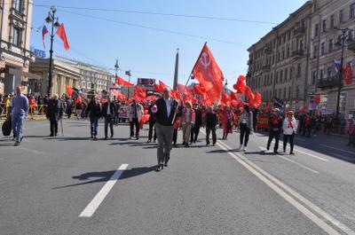 Вместе с КПРФ и Ленинским комсомолом РФ в колонне коммунистов по главной магистрали города на Неве прошли представители обманутых дольщиков, общественной организации «Дети войны», «Левого фронта», а также других общественных объединений. Лозунги были традиционными, праздничными, но вместе с тем боевыми: «Мир! Труд! Май!», «Вся власть Советам!», «Землю крестьянам – фабрики рабочим!», «Буржуи, под стол! Идет комсомол!». Всего в праздничных мероприятиях в одной колонне с коммунистами на главную магистраль города вышли более тысячи человек.
