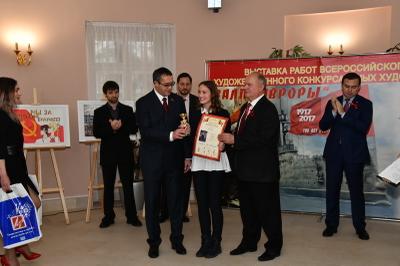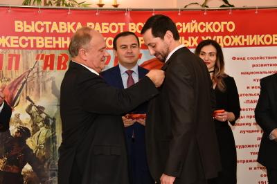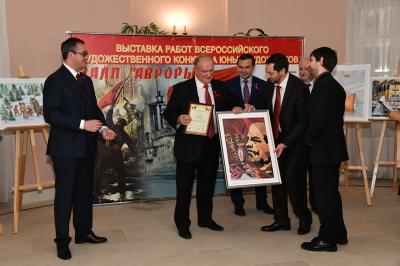 После этого состоялось награждение памятными медалями ЦК КПРФ в честь 100-летия Великого Октября организаторов мероприятия. Награды были вручены Г.К. Москаленко – генеральному директору издательского дома «Панорама»; П.Н. Соколову – руководителю Всероссийского конкурса юных художников «Залп «Авроры», главному редактору журнала «Русская галерея XXI век»; В.О. Куфтиной – заместителю руководителя Всероссийского конкурса юных художников «Залп «Авроры».