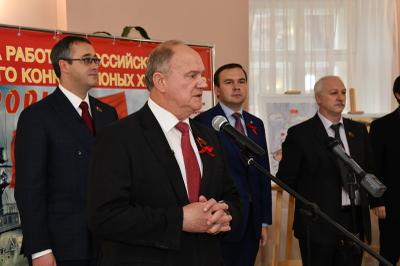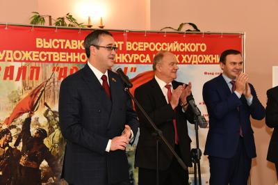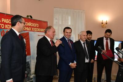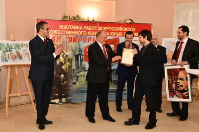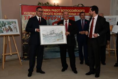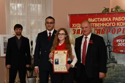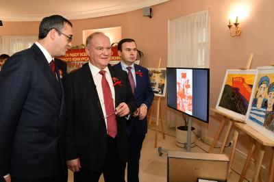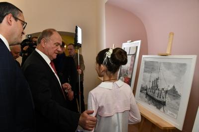 30 октября в Московской городской Думе открылась выставка работ участников Всероссийского конкурса юных художников «Залп «Авроры», посвященного 100-летию Великого Октября. В торжественной церемонии принял участие Председатель ЦК КПРФ Г.А. Зюганов.