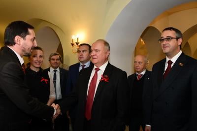 Открыл торжественное мероприятие Председатель Московской городской Думы А.В. Шапошников. Он поздравил всех присутствующих с Днем комсомола, который отмечался 29 октября. Затем слово для выступления было предоставлено Председателю ЦК КПРФ Г.А. Зюганову.