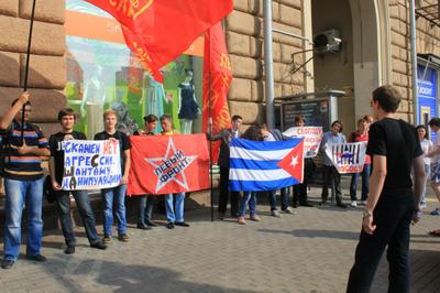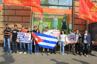 5 августа комсомольцы, представители Левого Фронта и движения за Каддафи и его народ вышли на пикет к посольству Соединенных Штатов, чтобы выразить свой протест гегемонистских устремлений североамериканского правительства. Выступающие говорили о том, что заточение кубинских патриотов — акт наступления современного фашизма, который необходимо стойко и слаженно отражать, и в этом ведущая роль принадлежит левой молодежи. Комсомольцы Н.Абрамов, А.Мкртичян и Д.Парфенов напомнили о великом прошлом нашего государства, когда Советский Союз помогал странам, не имеющим достаточной мощи, отражать наступление империализма и отстаивать свой путь построения справедливого общества, среди которых всегда была социалистическая Куба. США уже давно зарекомендовали себя в качестве мирового агрессора. Доказательство тому — недавние события в Ливии и Сирии. На очереди страны Латинской Америки, среди которых Куба и Венесуэла, а потом и Россия. Борьба за освобождение Пятерки — борьба против американской агрессии. В поддержку героического кубинского народа прозвучало несколько лозунгов на испанском языке: «Patria o muerte!», «El pueblo unido jamas sera vencido!». В заключительном выступлении товарищ из Левого Фронта В.Кузьмин поднял очень актуальную в современной России тему политических заключенных.