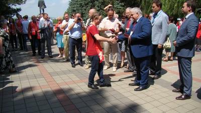 Затем «хозяин» мероприятия лидер ставропольских коммунистов Виктор Гончаров и высокие гости из ЦК КПРФ вручили партийные и комсомольские билеты тем, кто был по «Призыву Победы» недавно принят в ряды КПРФ и ЛКСМ.