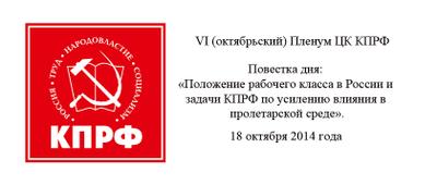18 октября в Подмосковье открылся VI (октябрьский) Пленум ЦК КПРФ. С отчетным докладом выступает Председатель ЦК КПРФ Г.А. Зюганов. Тема его доклада: «Положение рабочего класса в России и задачи КПРФ по усилению влияния в пролетарской среде».