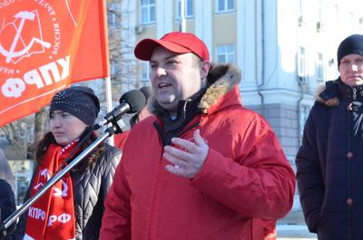 Открыл митинг Денис Сидоров, первый секретарь Рязанского обкома КПРФ, депутат, руководитель фракции КПРФ в Рязанской городской Думе.