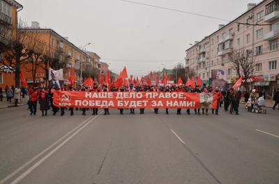 Колонна с красными флагами, транспарантами «Да здравствует Великая Октябрьская социалистическая революция!», «Правительство Медведева — в отставку!», «Нет росту цен и тарифов!», «Руки прочь от Ленина!» проследовала по Первомайскому проспекту до площади Ленина. Во главе колонны знаменосцы и «красная» молодежь. По традиции по ходу движения колонны звучали революционные и патриотические песни. Активное участие в шествии приняли активисты КПРФ и ЛКСМ, общественных организаций ВЖС «Надежда России», «Дети войны», ветеранов, жители города – около пятисот человек.