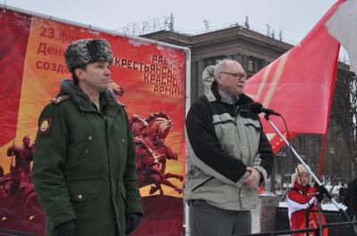 Открылся митинг выступлением депутата Государственной Думы ФС РФ, члена ЦК КПРФ, известного кинорежиссера В.В. Бортко, поздравившего собравшихся с очередной годовщиной со дня создания РККА и отметившего, что хотя российская армия насчитывает долгую историю, только Красная армия – единственная армия, не знавшая поражений. Владимир Бортко объяснил этот феномен тем, что Красная армия была подлинно народной армией – армией рабочих и крестьян – и поэтому знала, за что сражалась. «Говоря в этот день о нашем родном городе – Ленинграде-Петербурге – хочется выразить уверенность, что наш город, так же как и наша армия, не будет знать поражений и никогда не сдастся врагу, не позволит иноземному захватчику топтать свою землю», - подытожил свою речь депутат-коммунист.