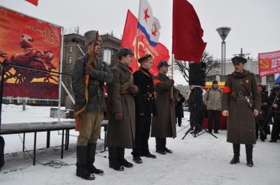 Комсомольцы из Военно-патриотического клуба «Комсомолец» под руководством Андрея Язова в форме бойцов Красной Армии различных периодов подготовили историко-театрализованное представление и в течение всего митинга рассказывали о героическом подвиге красноармейцев.