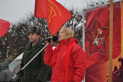 После выступления Владимира Бортко слово взяла первый секретарь Санкт-Петербургского горкома КПРФ, руководитель фракции КПРФ в Законодательном Собрании Санкт-Петербурга, член Президиума ЦК партии О.А. Ходунова, которая, в частности, отметила, что тяжелое положение в армии, грабительская реформа ЖКХ, обнищание населения, свертывание социальных гарантий – это звенья одной цепи, и ответственность за это должна нести действующая власть. В своем выступлении она вспомнила героический боевой путь Советской армии, создававшейся для защиты молодого советского государства, а впоследствии освободившей весь мир от коричневой чумы. Подводя итог своего выступления, Ольга Ходунова рассказала собравшимся об истории с судебным иском олигарха О. Дерипаски против лидера КПРФ Г.А. Зюганова и призвала ленинградцев активным протестом поддержать позицию Председателя ЦК КПРФ. «Зюганов прав!», - таким скандированием закончила свое выступление О.А. Ходунова.