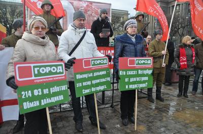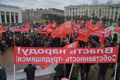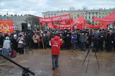 В митинге протеста, в ходе которого поднимался самый широкий круг вопросов – от необходимости укрепления оборонной мощи страны до обнищания населения в результате экономического кризиса, невзирая на пронизывающий шквалистый ветер, наряду с коммунистами приняли участие представители Ленинского комсомола РФ, ВСД «Русский Лад», Союза Советских офицеров, движения «Дети войны», Движения гражданских инициатив, Антифашистского комитета Санкт-Петербурга, «Левого фронта», обманутых строительной компанией «Город» участников долевого строительства жилья и других общественно-политических организаций города. По доброй традиции перед началом митинга партийные билеты были торжественно вручены вновь пополнившим партию товарищам. Также наиболее заслуженные ветераны были награждены памятной медалью ЦК КПРФ «70 лет Великой Победы».