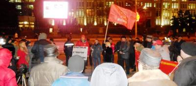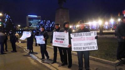 На площади, украшенной кумачом флагов и транспарантов КПРФ, собрались активисты КПРФ и водители-дальнобойщики с плакатами: "Дальнобойщики – не дойная корова!", "Платные дороги – это отсутствие продуктов в магазинах!", "Не хотим кормить Ротенбергов!", "Дальнобойщики против "Платона!" и др.