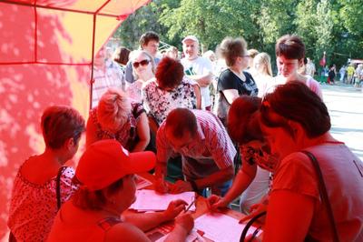 На мероприятии раздавались партийные газеты и был организован сбор подписей против повышения пенсионного возраста. Желающих поставить свою подпись было столь много, что образовалась целая очередь.
