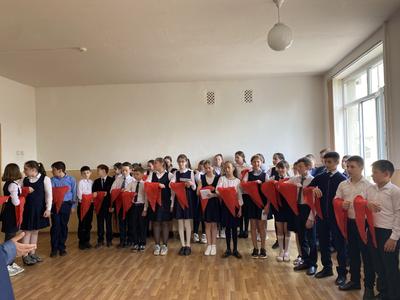 Затем для детей настал волнительный и радостный момент - прием в пионеры. Право повязать красные галстуки было предоставлено Тотровой Зарине, Артуру Хестанову, Ильгаму Гаписову. Перед всей школой пионеры дали торжественную клятву всегда выполнять пионерские законы.