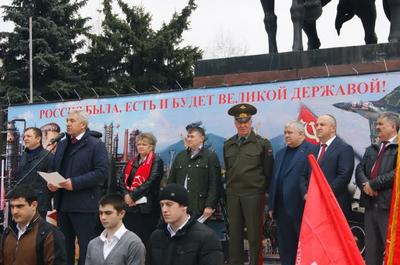 В митинге приняли участие депутат Госдумы ФС РФ, секретарь ЦК КПРФ, Первый заместитель Председателя ЦС СКП-КПСС, заместитель председателя Комитета по экономической политике, инновационному развитию и предпринимательству Казбек Куцукович Тайсаев, депутат Госдумы ФС РФ, Член комитета ГД по безопасности и противодействию коррупции Роберт Иванович Кочиев, Председатель Всероссийского общественного движения в поддержку армии, оборонной промышленности и военной науки ( (ДПА) Соболев В.И.