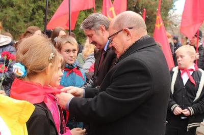 В завершение митинга О.А. Соломахин и Д.Г. Новиков по традиции вручили комсомольские билеты новому пополнению крымского комсомола, а также, вместе с секретарями Крымского рескома КПРФ, повязали пионерские галстуки ребятам, вступившим в ряды пионерии. Затем все присутствующие возложили цветы к обелиску «Павшим за Советскую власть».