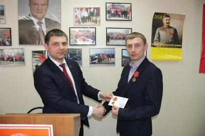 Первый секретарь Коми рескома КПРФ Олег Михайлов под бурные аплодисменты присутствующих наградил юбилейной медалью «100 лет Великой октябрьской социалистической революции» Виктора Вишневецкого и Василия Шестакова.