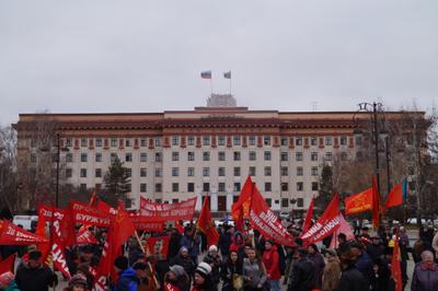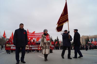 Все делегации фотографировались с лидером КПРФ области Казанцевой Т.Н. Во главе колонны шли комсомольцы с транспарантом, на котором были начертаны строчки из поэмы В. Маяковского« В.И. Ленин» - Ленин и теперь живее всех живых, наше знамя, сила и оружие! Колонна была праздничной и нарядной, флаги КПРФ, лозунги и призывы, а также шары, надутые гелием реяли над колонной. Впереди следовал агитмобиль КПРФ, с установкой, из которой звучали партийные, революционные песни, призывы, приветствия и поздравления. Музыкальное оформление осуществлял Беломоев Алексей, у которого все получилось просто здорово! Над колонной звучало многократное «Ура»! На Центральной площади колонна повернула к памятнику В.И. Ленина, где стояла сборная сцена, оформленная баннерами с праздничной тематикой. Первой на митинге выступила первый секретарь Тюменского обкома КПРФ Казанцева Тамара Николаевна. Ее выступление публикуется ниже. Также в числе выступающих были депутаты Тюменской областной Думы Юрий Юхневич и Сергей Левченко, помощник депутата Государственной Думы Дорохина П.С. Юрий Дранчук.