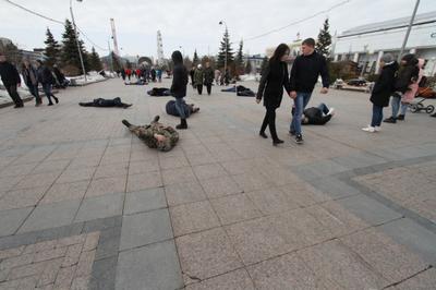 Руках лидера движения Анатолия Княжева была квитанция за услуги ЖКХ. Акция вызвала большой интерес у прохожих, которые стали интересоваться причиной такого странного поведения. Многие тюменцы, присоединяясь к акции, падали рядом.