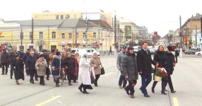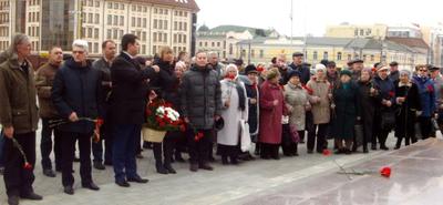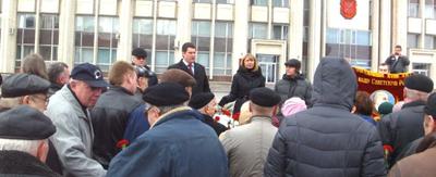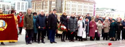 Тульские коммунисты под руководством секретаря обкома партии, заместителя председателя областной думы Алексея Лебедева прошли через площадь В.И. Ленина и остановились у пьедестала, чтобы провести митинг.