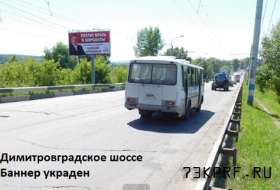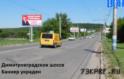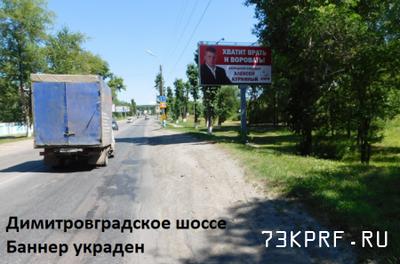 "15 июля, в пятницу, в Ульяновске были размещены баннеры с моим изображением и цитатой "Хватит врать и воровать!". Сегодня три из четырех баннеров были украдены. Владельцы рекламных щитов никакой информации о том, что случилось с нашими баннерами, предоставить не могут. Мы уже обратились в правоохранительные органы", - отметил лидер ульяновских коммунистов Алексей Куринный. Кстати, другой баннер с лозунгом "Медицина должна быть бесплатной!" злоумышленники предпочли оставить.