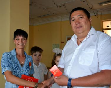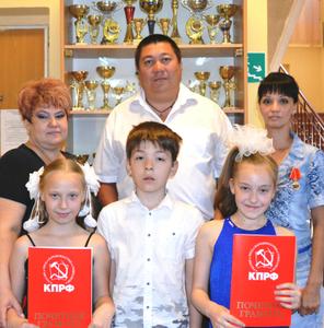 Далее Евгений Шаманаев вручил хореографическому ансамблю«АЮШКИ» Почетную грамоту ЦК КПРФ за личной подписью Геннадия Зюганова и ценный подарок – фотоаппарат. Руководителю танцевального коллектива Оксане Марковой кроме грамоты в торжественной обстановке под одобрительные аплодисменты коллег также была вручена памятная медаль в честь 90-летия образования СССР.