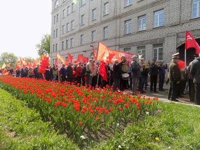 1 Мая с самого утра воронежская Площадь Победы запестрила красным. Как в прежние советские времена, на первомайскую демонстрацию в длинную краснознаменную колонну выстроились горожане.
