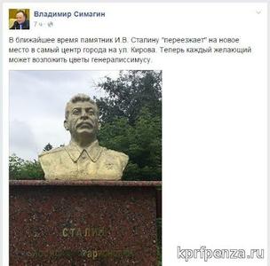 «В ближайшее время памятник И.В. Сталину "переезжает" на новое место в самый центр города на ул. Кирова. Теперь каждый желающий может возложить цветы генералиссимусу», - написал Владимир Александрович на своей странице в социальной сети и разместил фотографию памятника Сталину, который в настоящее время установлен в микрорайоне Райки возле здания Пензенского обкома КПРФ.