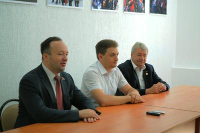 Первый секретарь обкома КПРФ, депутат областного Законодательного Собрания Георгий Камнев обратил внимание собравшихся на табличку, расположенную на новом здании обкома КПРФ.