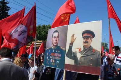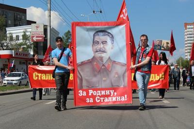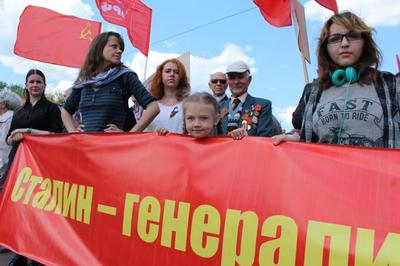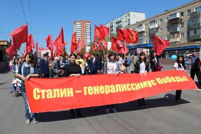 Впереди красной колонны активисты КПРФ несли большой портрет Верховного главнокомандующего Иосифа Виссарионовича Сталина, а за ним растяжку с надписью: «Сталин – генералиссимус Победы!».