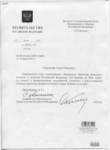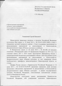 На имя депутата Госдумы фракции КПРФ (от Краснодарского края) С.П. Обухова пришло письмо от заместителя председателя Правительства РФ Д. Козака и исполняющего обязанности министра природных ресурсов и экологии РФ Д.Г. Храмова. Ранее депутат обращался с запросом по вопросу о финансировании мероприятий, связанных с рекультивацией и благоустройством дендрологического парка «Южные культуры».
