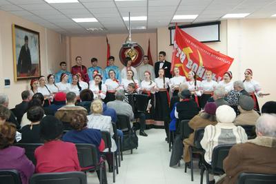 После участники возложили цветы к вечному огню и были приглашены в актовый зал Сталинградского обкома, где прошел праздничный концерт.