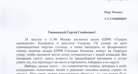 24 августа в центре Москвы состоится акция «Галерея кандидатов». Вдоль Тверской улицы будут размещены кубы кандидатов от КПРФ в депутаты Госдумы VII созыва по всем одномандатным округам столицы, а также кандидатов из федерального списка. Кандидат в депутаты Госдумы, действующий депутат Валерий Рашкин пригласил представителей московских властей в лице мэра Москвы посетить это мероприятие.