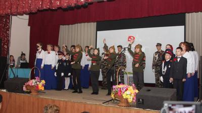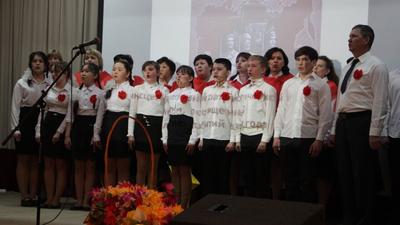 Затем в исполнении большого коллектива преподавателей и детей сводного хора «Патриоты Родины» средней школы поселка Ровное прозвучала «Песня о тревожной молодости»: