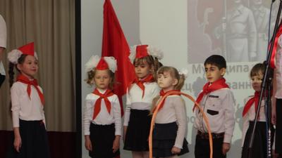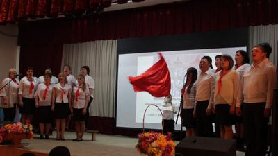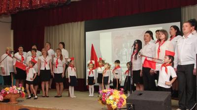 Пока сотрудники коллектива пели, дети постарше повязали малышам красные пионерские галстуки и отдали пионерский салют. Всё это происходило под красным пионерским знаменем. Зрители в зале громко аплодировали и дружно подпевали припев: