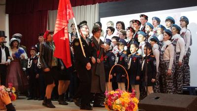 Дети в форме кадетов и учителя в строгой одежде в унисон, ритмично, красивыми голосами запели: