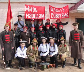 А в это время на сцене разыгрывался целый спектакль: сначала по сцене вальяжно прогуливались барон-буржуй с баронессой, а затем с Красным знаменем ворвались моряки и солдаты и прогнали ненавистных тиранов!