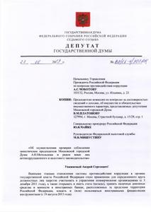 Копии запроса направлены также председателю комиссии по контролю за достоверностью сведений о доходах депутатов Мосгордумы Владимиру Платонову, генпрокурору России Юрию Чайке и руководителю Федеральной налоговой службы Михаилу Мишустину.