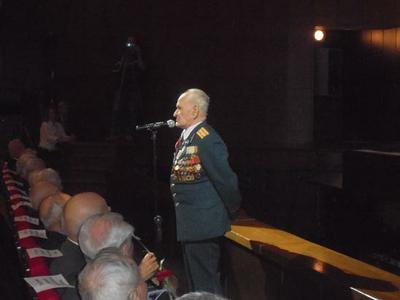 На сцене зала – фронтовик Василий Сенько. Он участвовал в Берлинском сражении. Танкисту Василию Моисеевичу Сенько хорошо запомнилось, как сидя в танке, он ждал сигнала к решающей атаке и как советские танки рванули к рейхстагу, получив приказ…