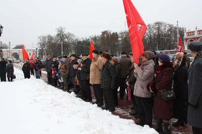 Коммунисты с алыми стягами и знаменами под военные марши духового оркестра проследовали колонной от площади Победы до площади Ленина. Участники шествия дружно пели советские песни, поздравляли калужан с праздником Великого Октября.