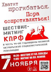 В честь 99-й годовщины Великой Октябрьской социалистической революции Калужским городским комитетом КПРФ совместно с Ленинским коммунистическим союзом молодежи, Движением в поддержку армии, организацией «Дети войны», советом рабочих и служащих города были проведены торжественное шествие и митинг.