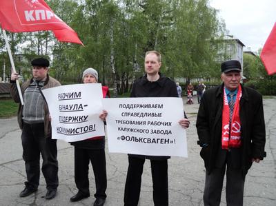 В протестном мероприятии приняло участие порядка 60 человек. Коммунисты и ополченцы вышли на акцию с лозунгами: «Поддерживаем справедливые требования рабочих калужского завода Фольксваген!», «Рабочим Барнаула – поддержку коммунистов!», «Мы солидарны с борющимися работниками «Метровагонмаша»!», «Вернем рабочим право на забастовку!», «Вернем рабочим право на оплачиваемый отпуск и выходные!», «Мы солидарны с требованиями забастовочного комитета рабочих завода «Фольксваген» в Калуге!», «Пролетарии всех стран соединяйтесь!» и «Спасение России –в единстве действий трудового народа». Поводом для проведения митинга стала ситуация на заводах: «Фольксваген» в Калуге и единственного в России производителя вагонов метро - «Метровагонмаш». У рабочих этих предприятий возник трудовой спор с работодателями, приведший к необходимости забастовочных действий, проведению которых власть всяческими способами пытается воспрепятствовать.