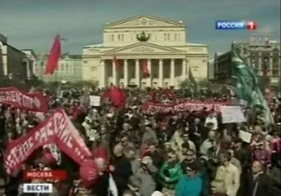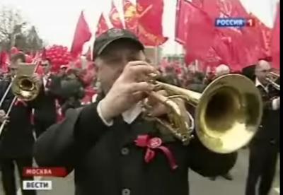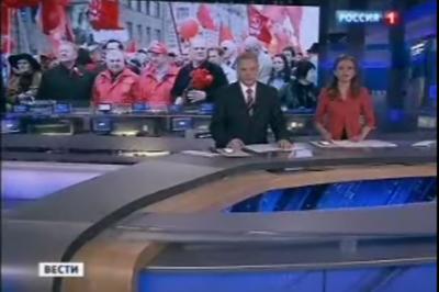 Телеканал "Россия" в вечерней программе "Вести" показал сбойку о первомайских шествиях в Москве. Отмечая массовость шествия КПРФ ведущий программы отметил, что с Кулужской площади колонна КПРФ вышла в пятитысячном составе, а до памятника Марксу коммунисты уже дощли 15-тысячной колонной.