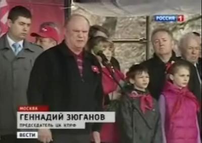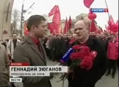 КОР: Пятитысячное шествие возглавляет бессменный лидер партии Геннадий Зюганов. Космос, ДнепроГЭС, целина. Под красными знаменами вспоминают ударный труд пятилеток. Сегодняшний рынок труда, по словам Зюганова, это когда обладатели красных дипломов не могут устроиться на работу.