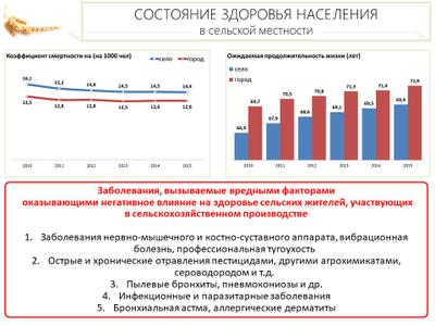 Условия жизни в сельской местности характеризуются повышенными физическими нагрузками, контактом с вредными веществами, используемыми в сельском хозяйстве. Целый перечень вредных факторов определяет более высокий, чем в городе, коэффициент смертности и, соответственно, продолжительность жизни – в среднем на 2 года меньше чем в городе.